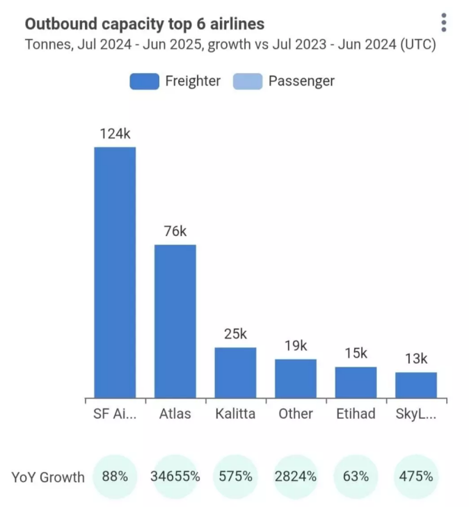 根据Rotate的数据,2024年7月至2025年6月期间,鄂州花湖国际机场的货运航班出港量大幅上升,多家航空公司报告货运量同比大幅增长。其中,顺丰航空以12.4万吨的出港运力位居第一,同比增长88%;阿特拉斯航空(Atlas Air)紧随其后,出港运力7.6万吨,同比增长高达34,655%,显示出其在该机场的迅速扩张或新进入机场网络。