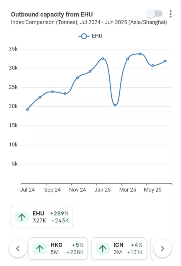 Rotate的数据显示,2024年7月至2025年6月期间,鄂州花湖国际机场的出港运力达32.7万吨,同比增长289%。该机场在2024年底持续实现月度增长,在2025年初出现短暂回落后,于年中稳步回升。相比之下,香港(HKG)和仁川(ICN)同期增长率分别仅为5%和4%,要小得多。