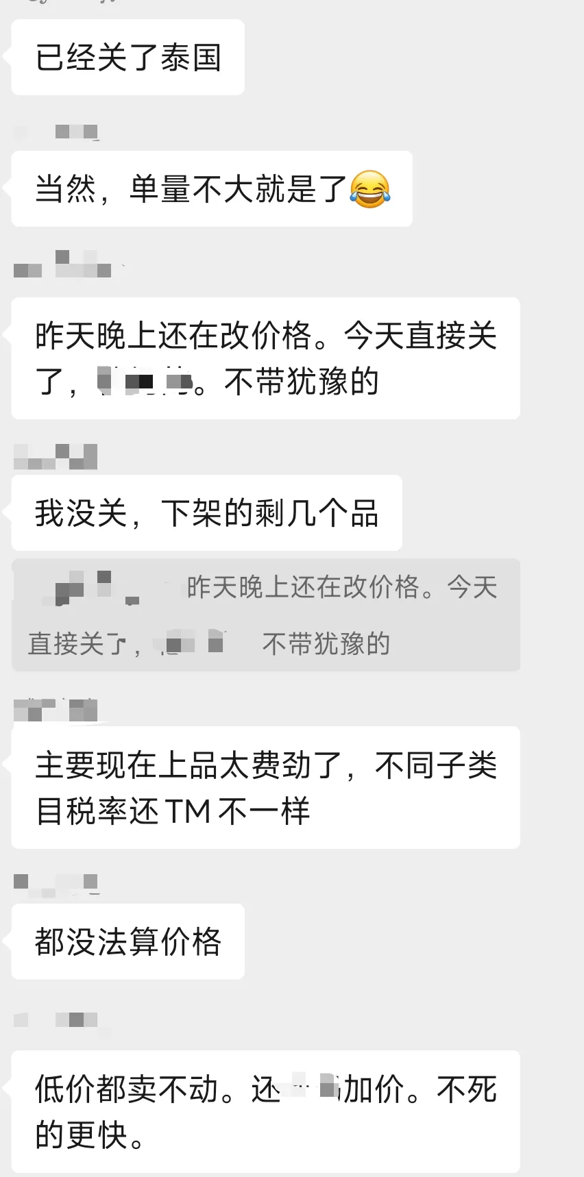 新政落地后,泰国跨境卖家交流群里的焦虑情绪持续蔓延,“改价难、利润薄、合规严” 成为高频槽点,部分卖家已做出极端选择: