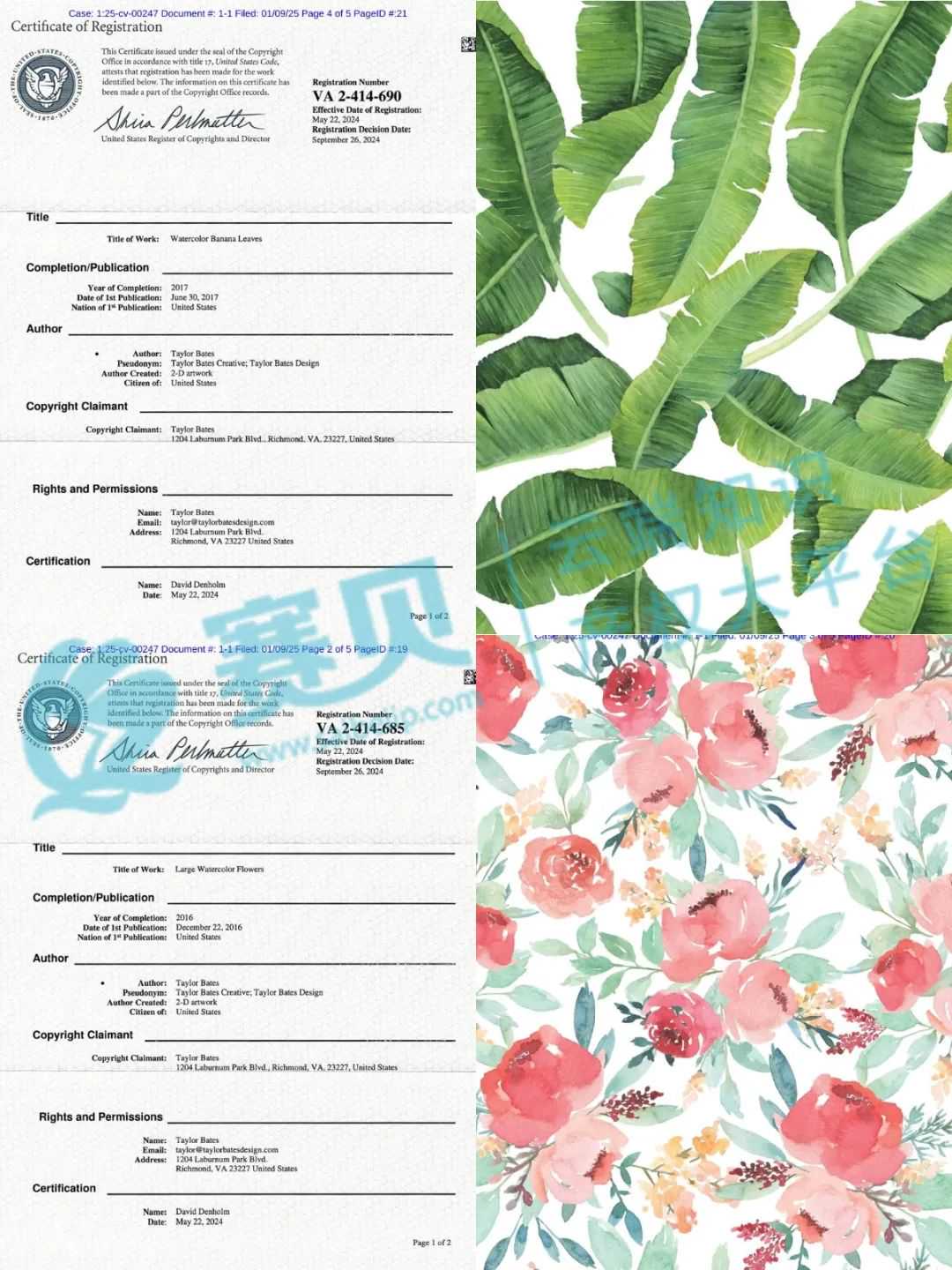 【25-cv-247】Taylor Bates水彩插画TRO版权维权,这两张植物图片请谨慎使用!未开始冻结账户资金!