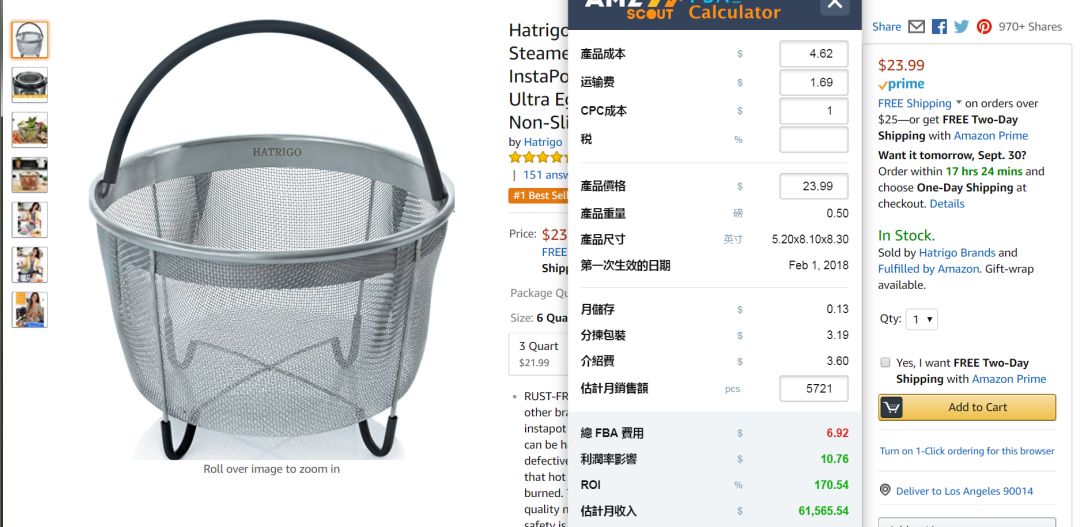 笔者以一个不锈钢蒸篮产品为案例,来分析蒸蓝的利润情况。这款产品是Hatrigo品牌下的产品,上架时间为2018年1月,月销6909单,售价为23.99美元。下面来核算一下该产品的利润情况: