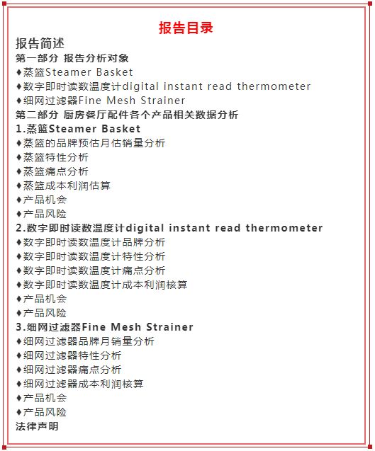 以上为报告试读部分,本篇报告完整目录如下,如需查看数字即时读数温度计和细网过滤器等产品数据分析,请关注【喜课科技】-点击菜单栏【选品报告】: