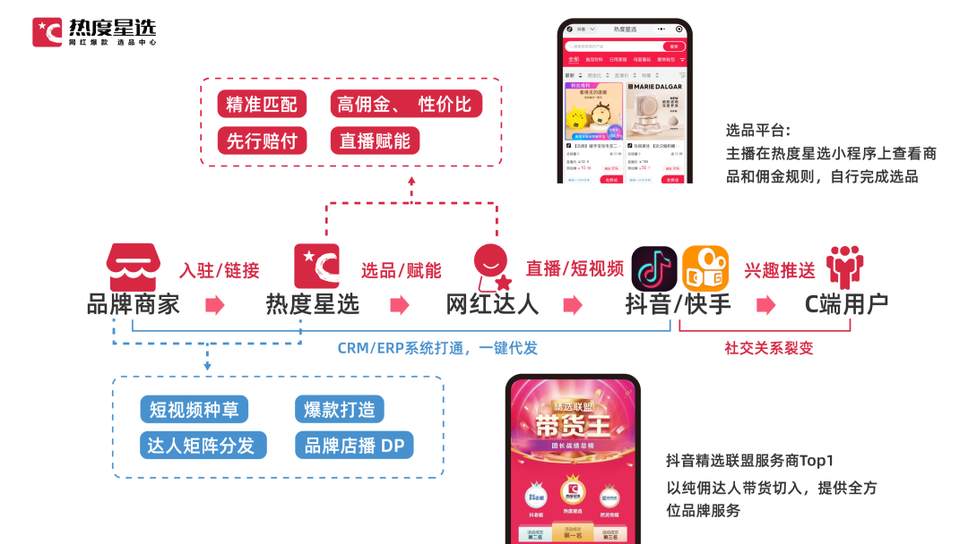 兴趣内容电商生态的服务商必须能提供选品以及推爆品的能力,而不仅仅只是单纯广告策划或代播。单纯的广告公司难控销售端以及ROI,而代播公司很难沉淀出壁垒,并且很难规模化。如热度星选利用SAAS平台,以纯佣达人分发矩阵切入,也在沉淀选品、打爆新品和供应链能力。
