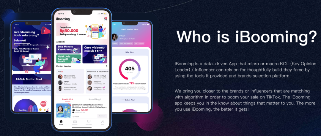对标热度星选,iBooming主要立足东南亚市场,围绕TikTok等新兴流量平台进行内容电商布局。作为印尼面向网红和品牌的SaaS服务平台,iBooming致力于为东南亚有需求的品牌商匹配KOL,搭建更加高效的销售途径;为KOC&KOL提供更精细化的选品组合策略和直播赋能。