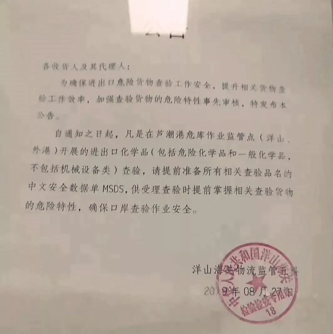 近期从上海港出运危险品的外贸、货代朋友们注意了!日前,洋山海关物流监管五科发布了新通知:自8月27日起,凡在芦潮港危库作业监管点(洋山、外港)开展的进出口化学品(包括危险化学品和一般化学品,不包括机械设备类)查验,请提前准备所有相关查验品名的中文安全数据单MSDS,供受理查验时提前掌握相关查验货物的危险特性。
