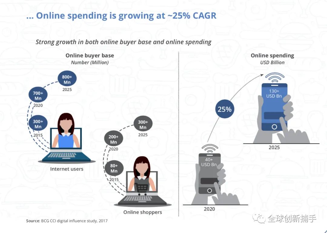 今年 1 月时,BCG 与谷歌联合发布分析报告《揭秘印度在线外卖消费市场:一个 80 亿美金的机会》指出,与印度持续增长的互联网用户规模相比,呈现更高速增长趋势的在线购买人群规模则是驱动印度互联网经济的核心要素。
