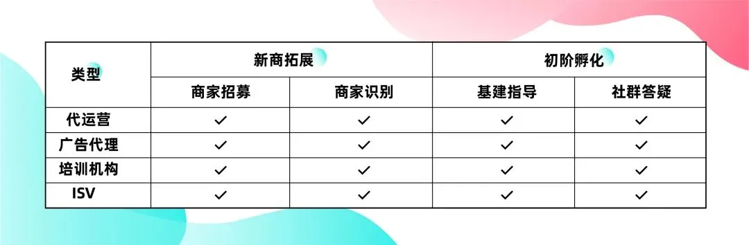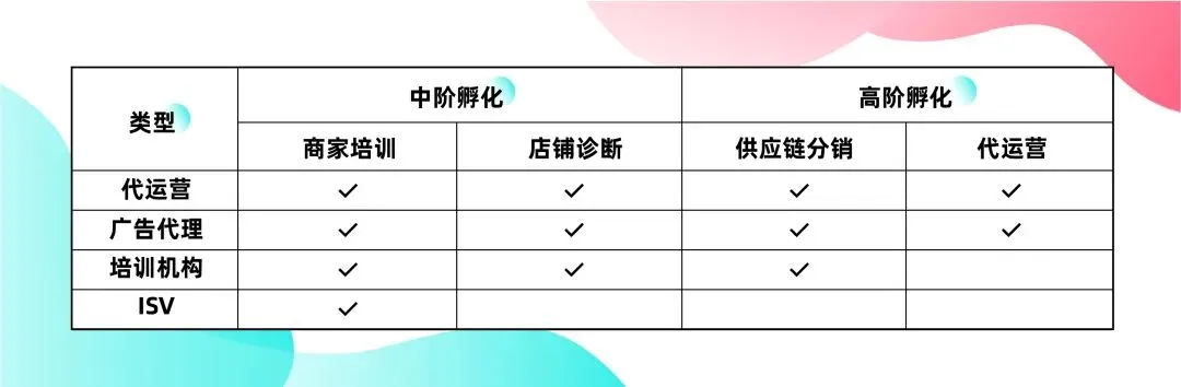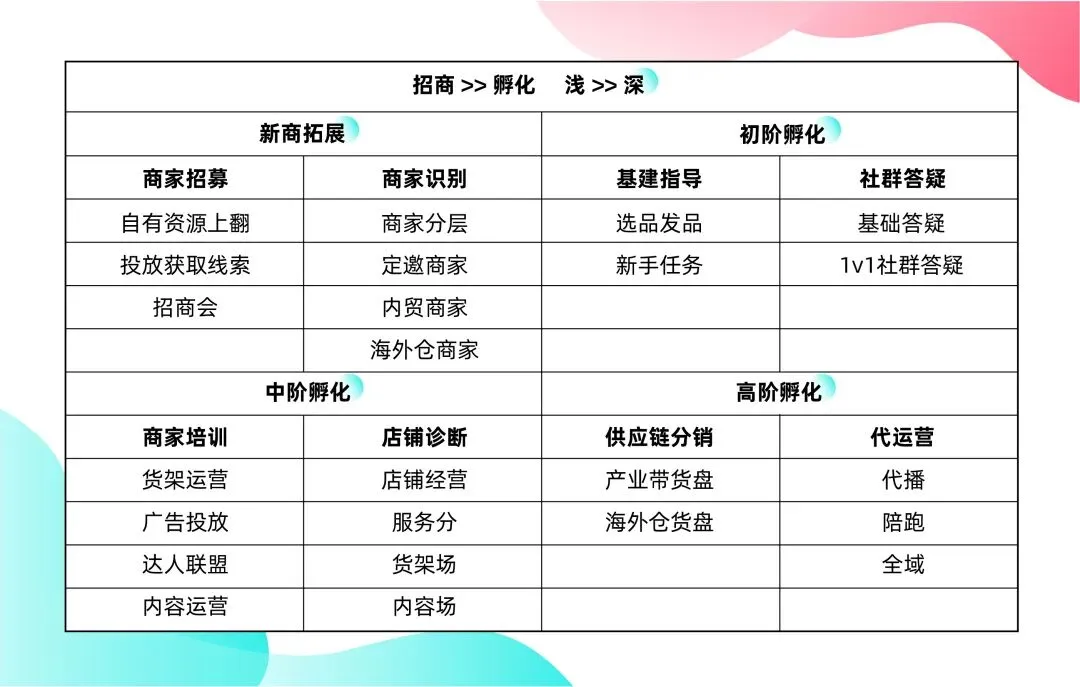 目前招商服务商生态服务贯穿从招商到孵化各个阶段,分为商家招募、商家识别、基建指导、社群答疑、商家培训、店铺诊断、供应链分销、代运营等8个能力项,由浅入深,从招商服务商到招孵一体服务商能力进阶。
