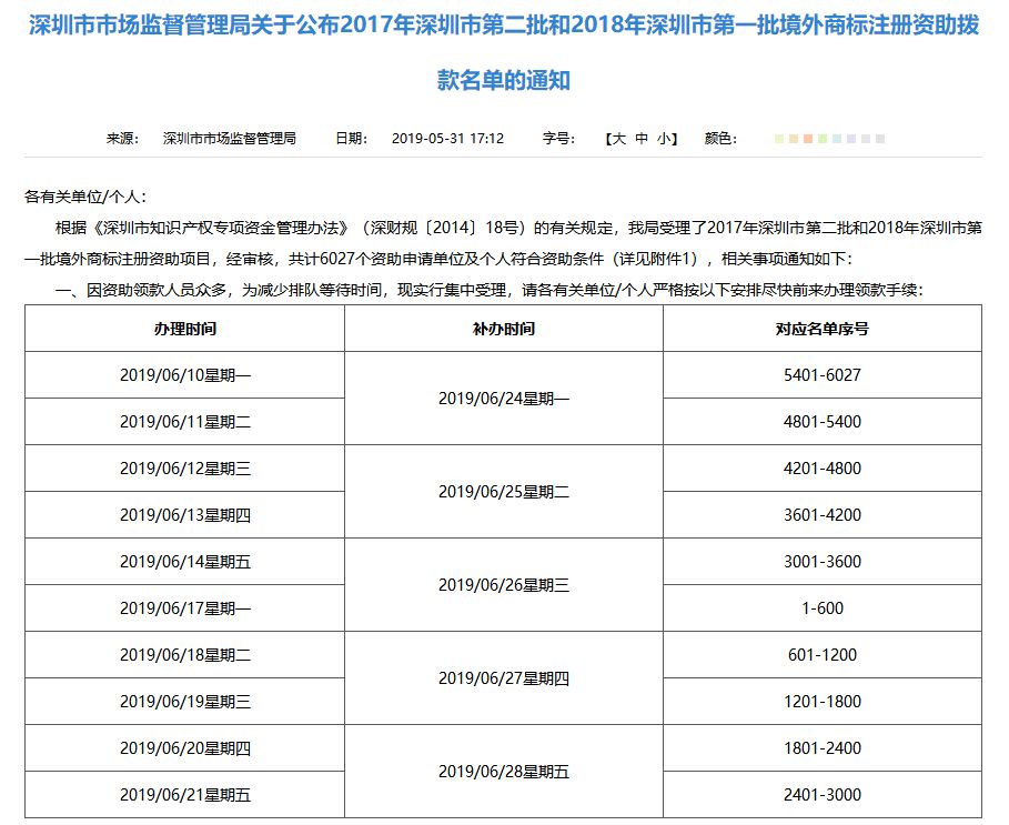 以下是深圳市市场监督管理局关于公布2017年深圳市第二批和2018年深圳市第一批境外商标注册资助拨款名单的通知