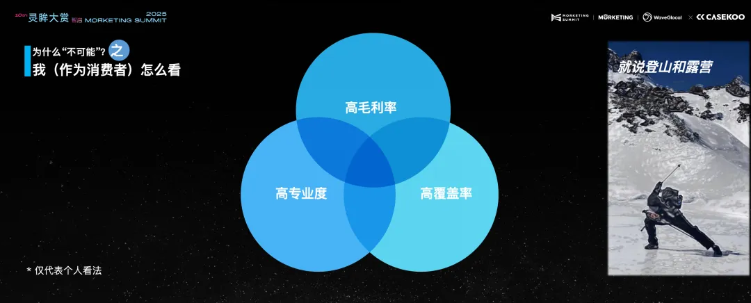以登山、露营等户外品类为例,这是近年来消费者关注度较高的领域。在这个领域中,高毛利率与高专业度往往难以同时成立。