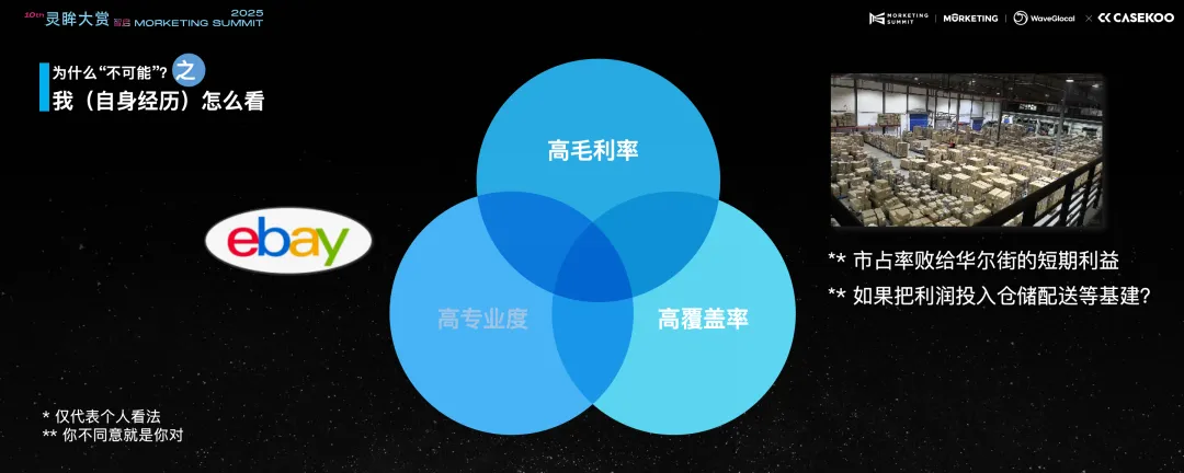 如果当年eBay把利润更多投入到仓储和物流,而不是用于给华尔街的股东分红,会不会是另一种结局?我们无法确定。但可以确认的是,在我还在eBay工作时,我曾经提过类似的方向,公司内部也尝试过一些探索,只是最终没有坚持下来。因此,每个公司有自己的选择,每个公司也会为自己的选择去收获长期价值或者去买单。