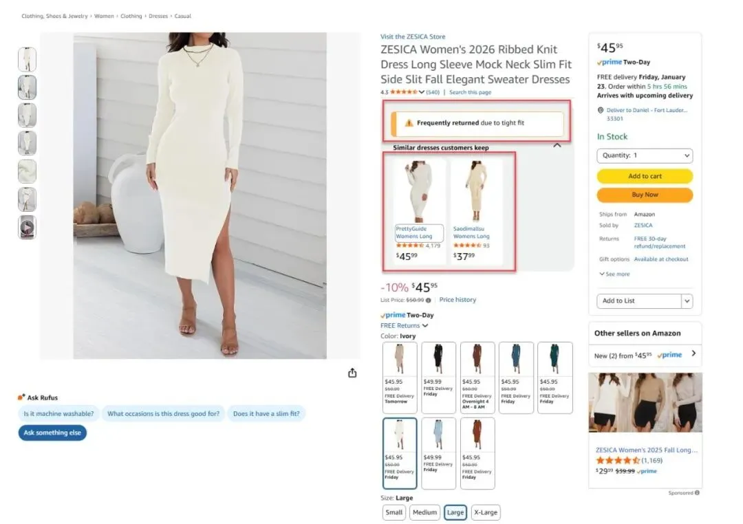 例如以上这个女装链接,"Frequently Returned"的原因,是“tight fit”。加上主图左下方的Rufus提问,消费者几乎可以很快判断自己买了是否也会后悔退货,因此大概率不会下单,从而也就降低了退货的可能性。