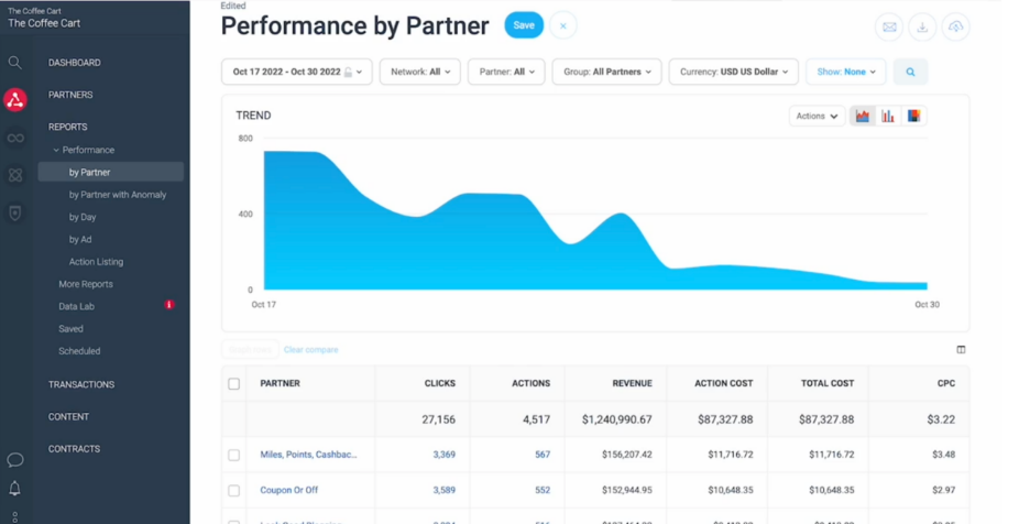 ● 以数据驱动资源分配。Ulta Beauty通过以上功能与众多营销伙伴建立了蓬勃发展的合作关系,为了提高资源使用效率,进一步使用了impact.com的优化报告来分析营销伙伴的表现,调整资源分配。impact.com为运营多个推广项目的营销人员提供了一个统一管理的平台,同时凭借强大的数据追踪技术与科学的营销归因,通过Reports板块给营销人员提供了项目运营数据看板,支持从营销伙伴、营销项目、活动周期等多维度查看营销项目运营数据。营销人员还可以借助「Contribution」界面明确营销伙伴在消费者购买旅程中创造的价值,并根据其实际绩效结果进行佣金的分配,激活营销伙伴的活力,不断优化资源投入。