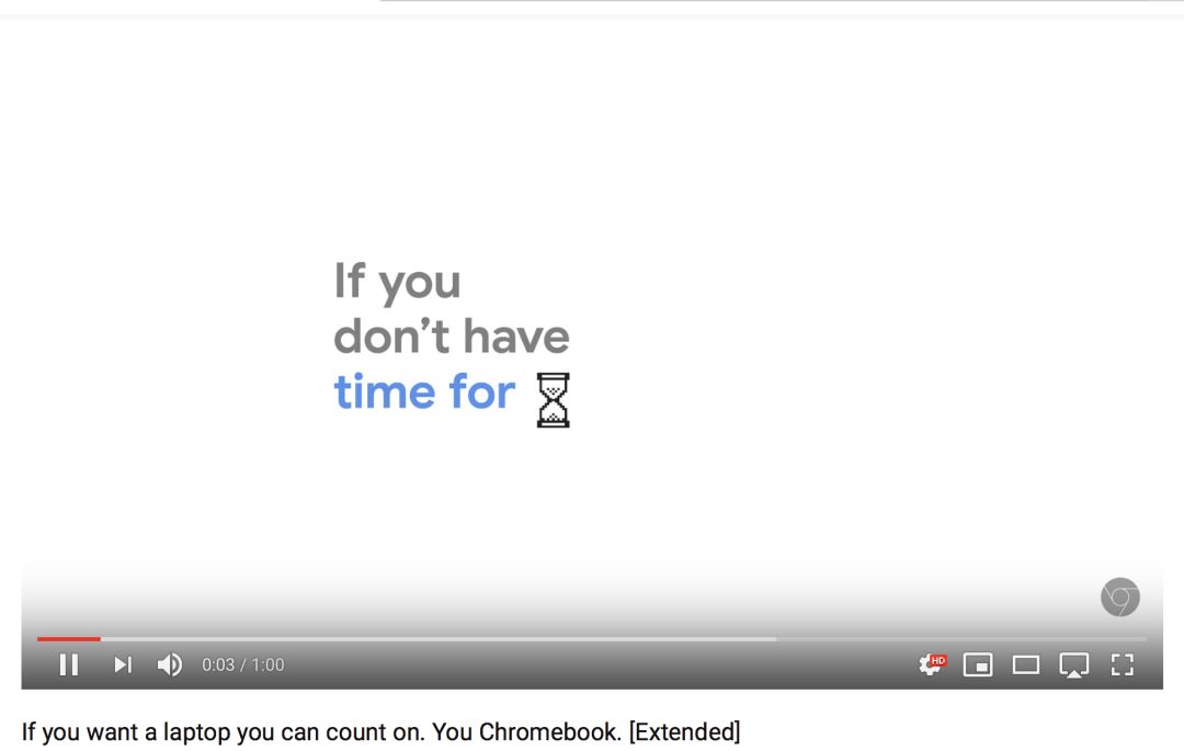 你也可以开始抛出一个问题,比如关于行业的痛点,引发用户的思考,后面再一一讲述解决方案。比如下面这个chrome笔记本的广告在前3秒就吐槽windows的痛点,而且利用纯色背景加大标题,可以有效地集中用户的注意力。