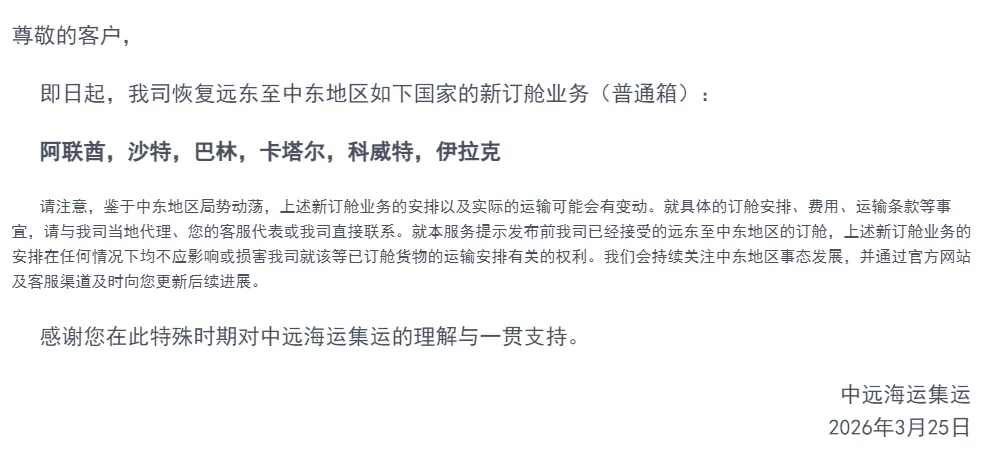 在此背景下,中远海运集运3月25日发布公告,宣布即日起恢复远东至阿联酋、沙特、巴林、卡塔尔、科威特、伊拉克的新订舱业务。该消息在业内引起广泛关注,部分从业者据此认为霍尔木兹海峡通行已恢复。