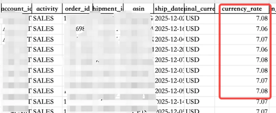 每一笔订单还强制匹配了当天的央行官方汇率,直接换算出对应的人民币绝对值。