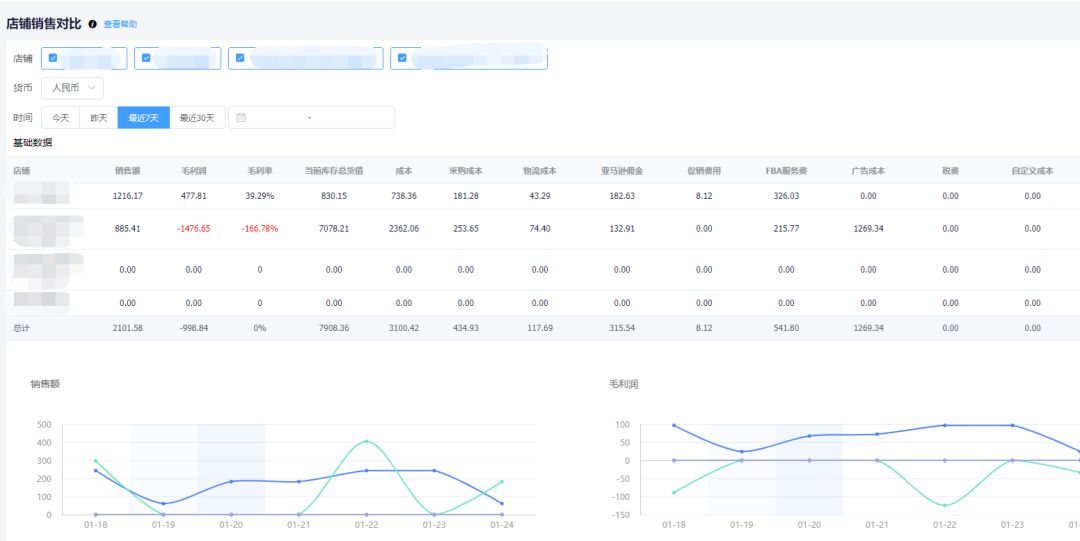 1. 为您汇总多个店铺的销售数据,还可以对比各个店铺的销售额、毛利润、成本、库存总额等核心数据;