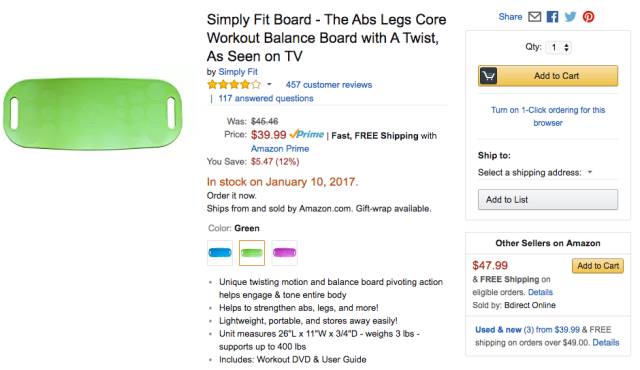 而一款品牌为 Simply Fit 的健身平衡板该周内榜单排名一路走高,并于2016年12月29日之后连续四日蝉联 Best Seller 榜单榜首,同样表现优异。