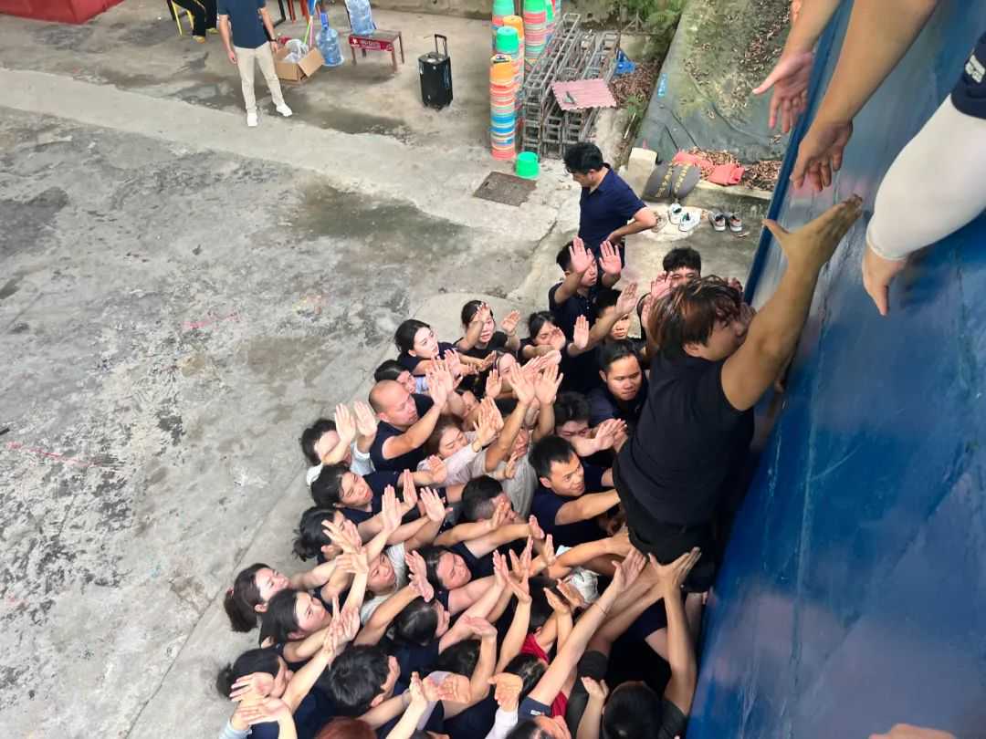 最后的“勇攀巅峰” 项目,堪称整个拓展活动的经典与高潮。一面高达 4.2米的光滑墙壁,没有任何辅助工具,所有队员要在规定时间内全部翻越过去。面对这道看似无法逾越的障碍,有人主动蹲下做人梯,有人在上方接应,在大家的共同努力下,成功翻越毕业墙。