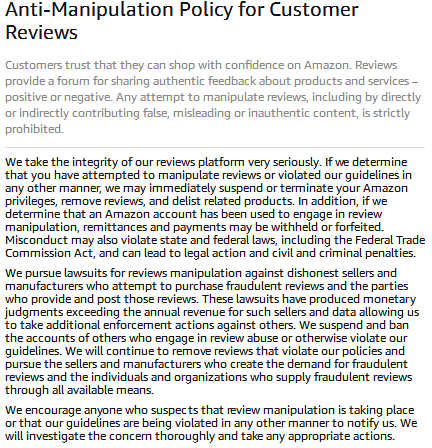 如果我们确定您尝试以任何方式操纵评论或违反我们的规定,我们可能会立即暂停或终止您的销售权限,并删除评论和相关产品。另外,如果我们确定一个亚马逊账号参与了操纵评论,其款项将被扣留或没收。以上这些不当行为也可能违反国家和联邦法律,包括“联邦贸易委员会法”,并可能导致法律诉讼和民事及刑事处罚。