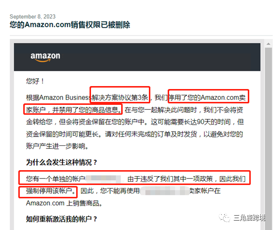 3.造成这一情况的原因是卖家的另外一个单独账户,违反了亚马逊的某一项政策,因此该账户被关联停用。