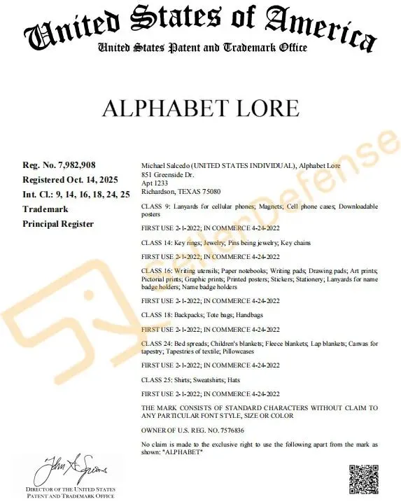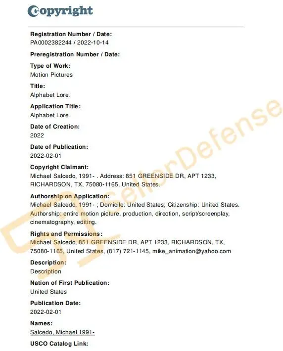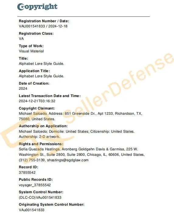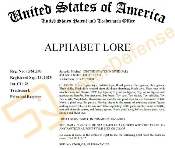 Alphabet Lore 字母传说是原告 Mike Salcedo 创作的一个流行动画系列。 在动画中,英文字母们拥有生命,有独特的个性、外貌和基于其发音或形状的“超能力”。动画独特的创意、魔性的画风和戏剧性的情节使其在网络上迅速走红,催生了大量的二次创作、表情包和游戏。本案为商标+版权双重维权,具体版权图片未公开,请相关卖家注意排查避雷!