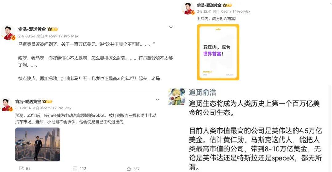 然而,比奢华年会更具话题讨论度的,是创始人俞浩在年会现场抛出的一系列充满个人色彩的“狂言”。事实上,他此前在社交平台就已发表过不少引起行业热议的观点,如“追觅生态将成为人类历史上第一个百万亿美金的公司生态。”再比如其更大胆的预判“20年后,tesla会成为电动汽车领域的irobot。被打到接连亏损和退出电动汽车市场。‘当然,小马哥不会承认,他会说是自己主动退出的’”,这些犀利的言论早已在科技圈引起诸多关注。