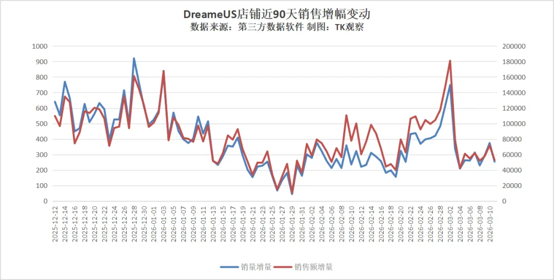 再聚焦到追觅在TikTok的店铺本身,店铺近28天销售额破百万美元,且自@DreameUS店铺上线至今,累计总销量达11.02万单,总销售额达2280.78万美元。TK观察发现,从近90天趋势来看,店铺整体营收呈稳步增长的正向趋势,但单日增幅维度则存在较为明显的波动。1月初至2月末,店铺增幅明显放缓,单日销量增量从800+回落至200-400区间,销售额亦同步回落,或许因告别2025年年末购物狂欢季,店铺进入阶段性调整期;而3月初又出现明显反弹,或许即将到来的春季大促相关,这一趋势也印证了即便如追觅这般的头部品牌,店铺增长依旧会受到大促节点的影响,年末大促爆发带动店铺销量上升,大促结束后店铺整体进入恢复调整期。