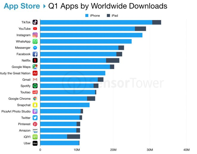 第三方数据机构Sensor Tower 最新发布的报告显示,TikTok在App Store和GooglePlay上的下载量已经超过了20亿次,与最火爆的YouTube、Instagram、WhatsApp、以及 Messenger并列第一梯队。
