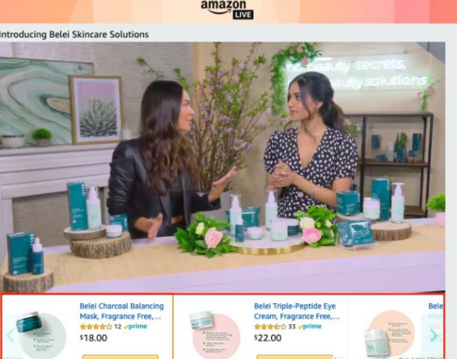 下图是网红Marianna Hewitt在亚马逊上直播新自有品牌Belei护肤解决方案例子。你可以直播时在视频下方展示产品,以便用户可以轻松访问以购买你的产品。