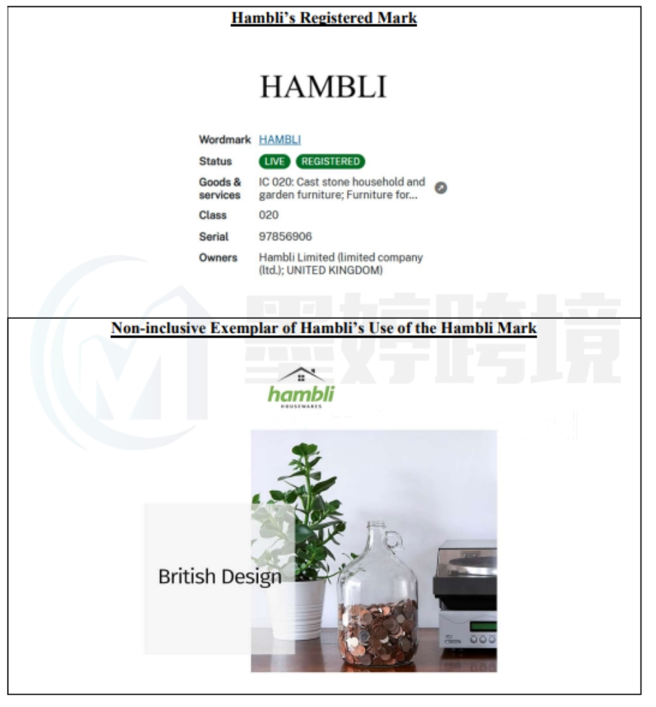 本案为商标+版权侵权,涉及原告旗下1个商标,维权关键词:Hambli;以及9张版权图片,Hambli在起诉书中指出,相关产品图片受《版权法》和《伯尔尼公约》保护;