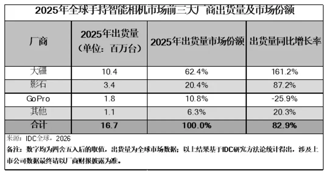 据IDC数据,2025年全球手持智能相机市场爆发式增长,出货量达1665万台、同比增83%,销售额突破461亿元;其中大疆以62.4%的出货量份额居首,影石紧随其后,昔日巨头GoPro已被彻底边缘化。