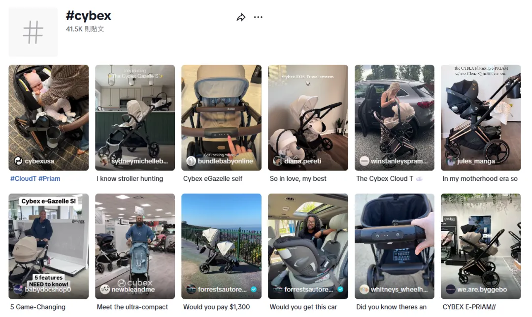 如果说联名是“定调”,那么社媒营销就是“破圈”——CYBEX跳出传统母婴品牌的单一营销模式,在TikTok等海外核心社媒平台,构建“头部破圈+垂类种草+素人裂变”的分层红人矩阵。