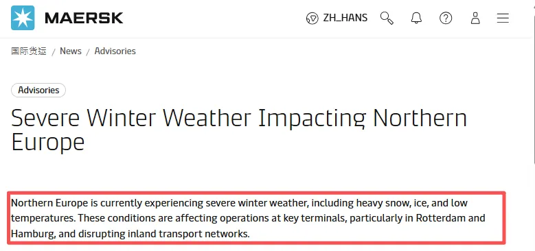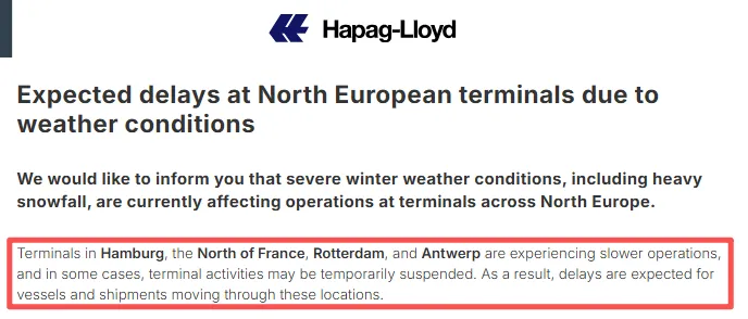 马士基在公告中明确指出,鹿特丹和汉堡等主要码头的运营受到严重干扰,码头和仓库的生产效率下降,积雪和结冰的路面状况还导致交通拥堵和延误。赫伯罗特也发布通知称,北欧各地码头,包括汉堡、法国北部、鹿特丹和安特卫普等地的码头作业速度放缓,部分码头作业甚至可能暂时中止,途经这些地点的船舶和货物预计都将受到延误。