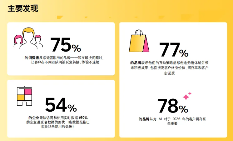 SAP Engagement Cloud《全球客户参与度指数报告》中提到,77%的品牌表示他们的互动策略能够创造无缝体验并带来积极成果,包括提高客户终身价值、留存率和客户忠诚度。但82%的消费者承认,曾对某个品牌感到失望。