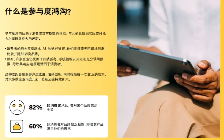这里有一个概念能够精准地说明品牌与消费者之间的认知错位——参与度鸿沟。其中,参与度指任何能够积极影响消费者对您品牌看法的交互行为,包括营销、产品、服务、运营、社群等。鸿沟则可以概括为,消费者期望的体验与组织实际交付能力之间的巨大差距。