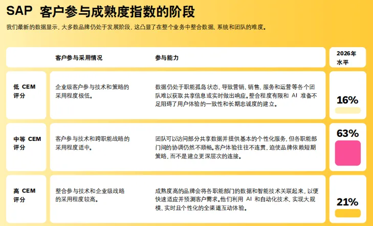 在2026年, SAP Engagement Cloud根据全球市场的变化,为了进一步帮助品牌了解如何协调人员、流程和技术来提供连贯、智能的客户体验,客户参与成熟度 (CEM)的评估,进一步更新为AI和自动化应用、互联数据策略、客户忠诚度、全渠道互动、实时个性化体验、邮件营销的应用六个维度。数据显示,大多数品牌仍处于发展阶段,整个业务中整合数据、系统和团队的难度仍然较高。