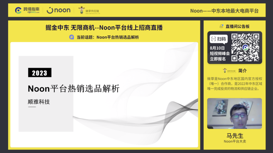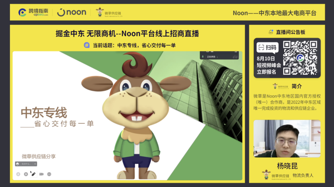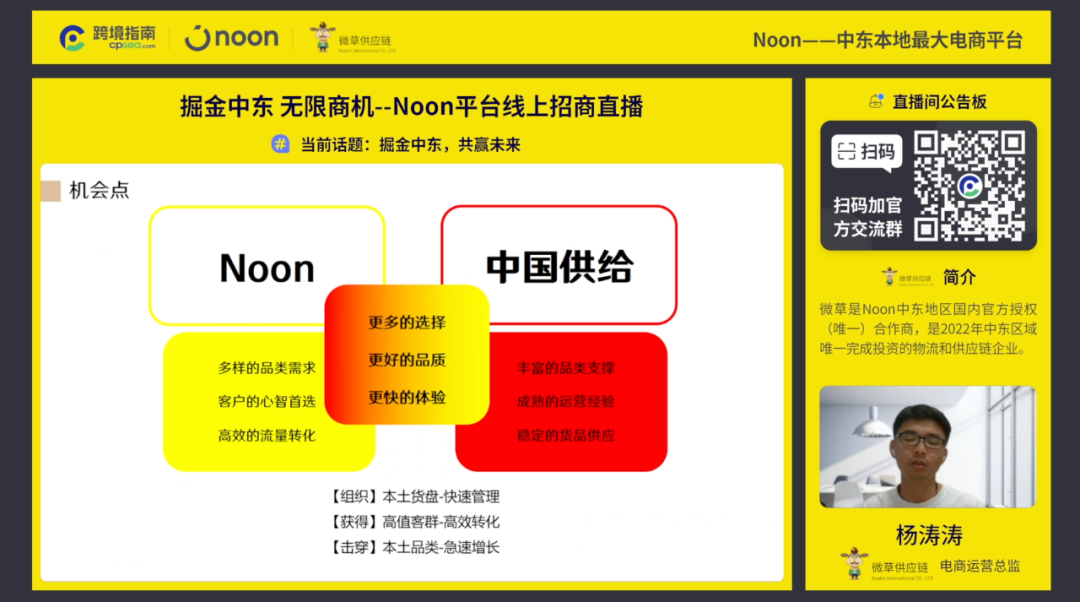 为助力卖家开拓中东市场,跨境指南Cpsea于2023年7月7日19:00-20:00线上举办《掘金中东,无限商机》招商直播活动,本次邀请到Noon官方合作商-微草供应链电商运营总监杨涛涛、微草供应链创始人和物流负责人杨晓昆、Noon平台头部卖家马先生,围绕中东市场发展机遇、出海痛点解析和解决方案以及Noon平台热销品打造计划,为卖家掘金中东市场提供服务支持。