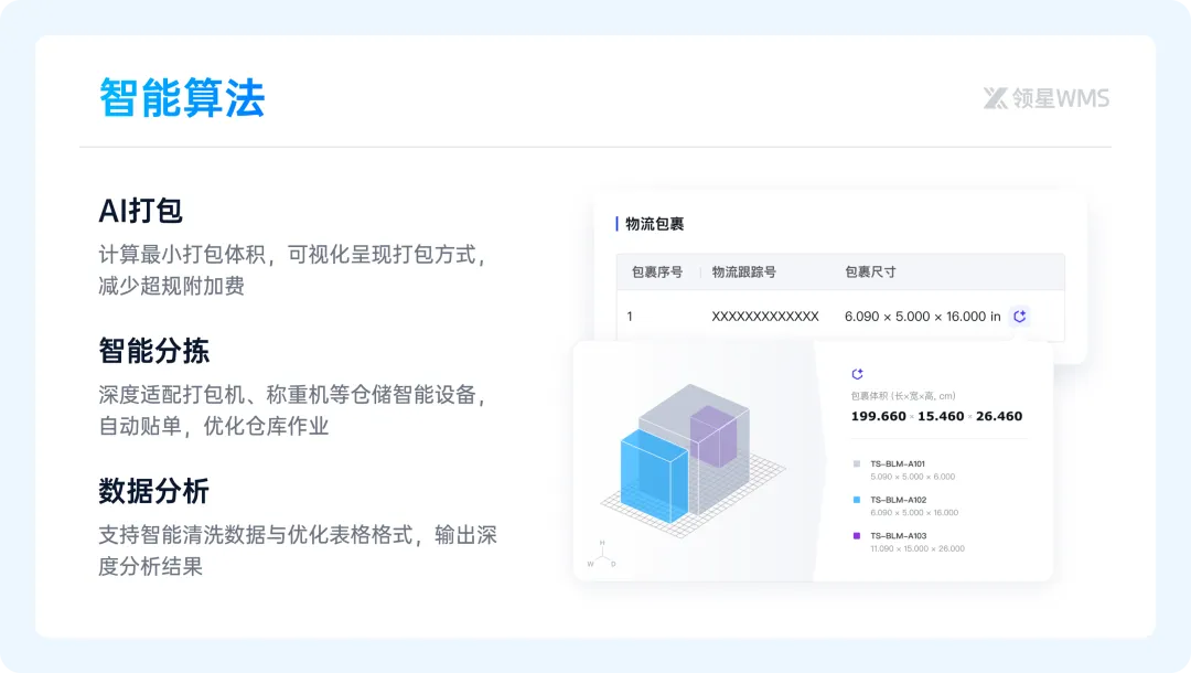在成本管控层面,联宇物流借助领星WMS智能算法能力,进一步优化成本管控,协助跨境卖家在复杂物流规则中锁定最优成本方案。领星海外仓系统的AI体积优化算法,可以在拣货打包环节为操作人员提供精准装箱建议,实时预判包裹规格,有效规避因包装不当产生的超长、超重附加费。