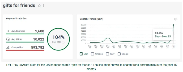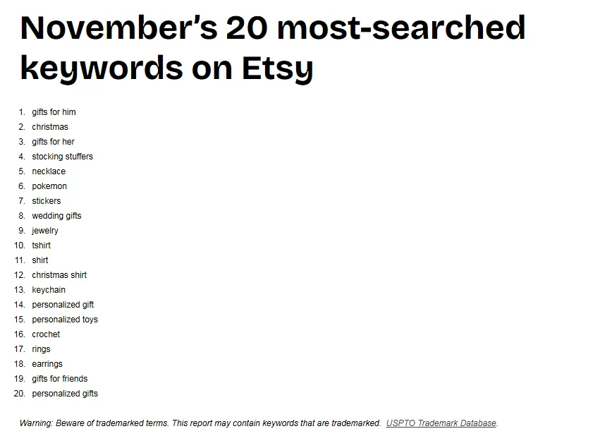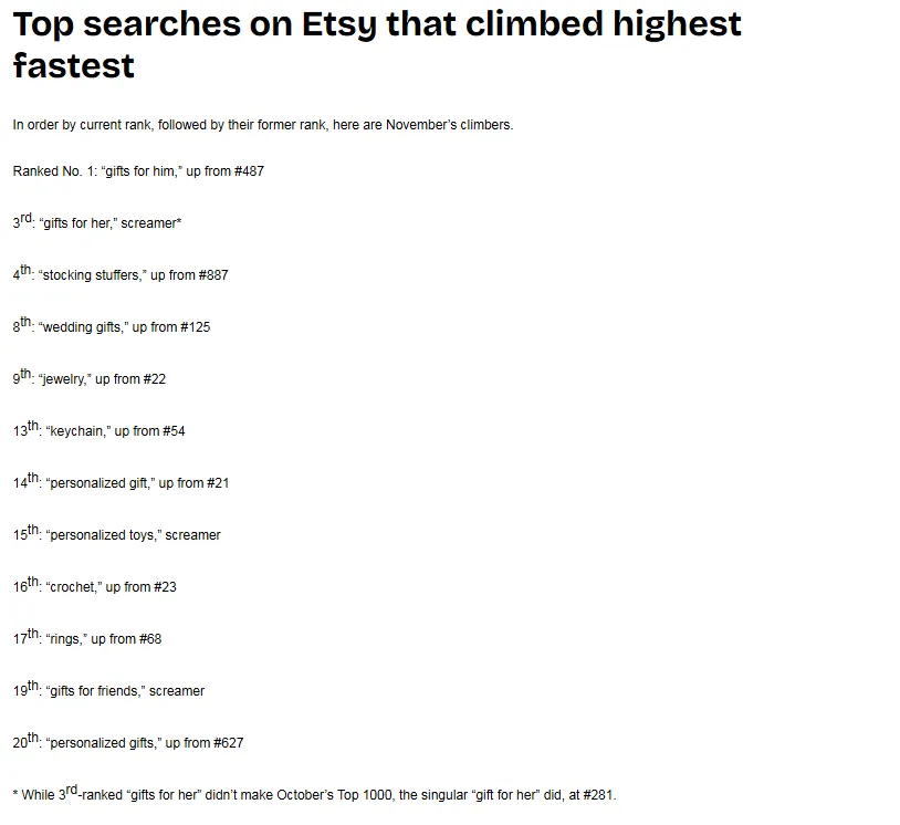 又到了一年一度的大型节日季!Etsy 热门搜索榜单前 20 名的排名也随之频繁变动。