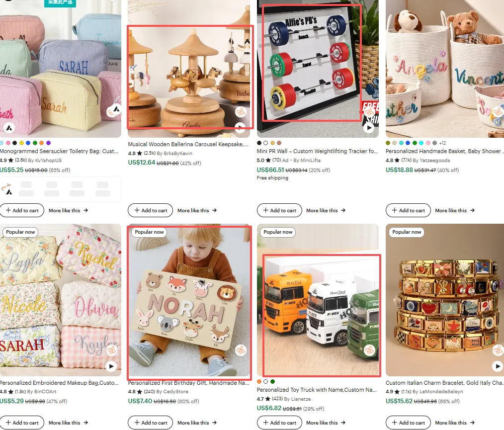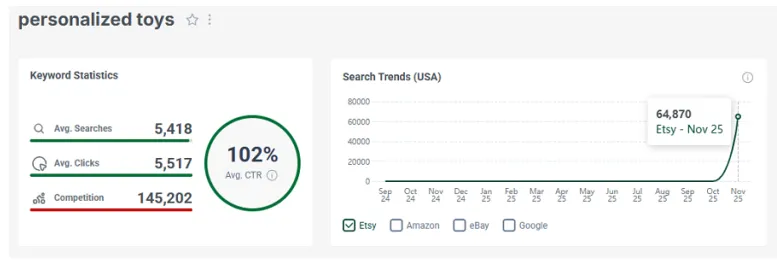 11 月份的搜索热度前 1000 名中,有 15 个搜索词包含“个性化”。Etsy 本身很可能就是这波搜索热潮的幕后推手。有人在 Etsy 首页上看到过个性化玩具的促销活动吗