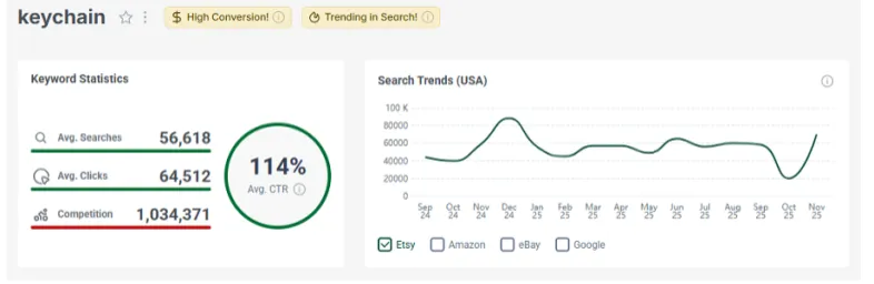 不过,我们想重点介绍这个关键词的原因是右上角的折线图。10 月份,“钥匙扣”的搜索量跌至 15 个月以来的最低点。各位钥匙扣卖家当时是不是很担心?如果是的话,正如你所看到的,这个月它的搜索量又迅速回升了:太棒了!