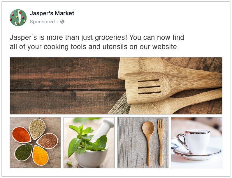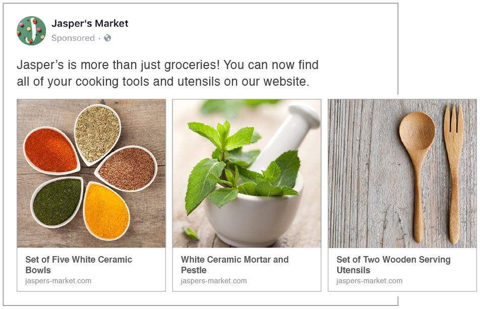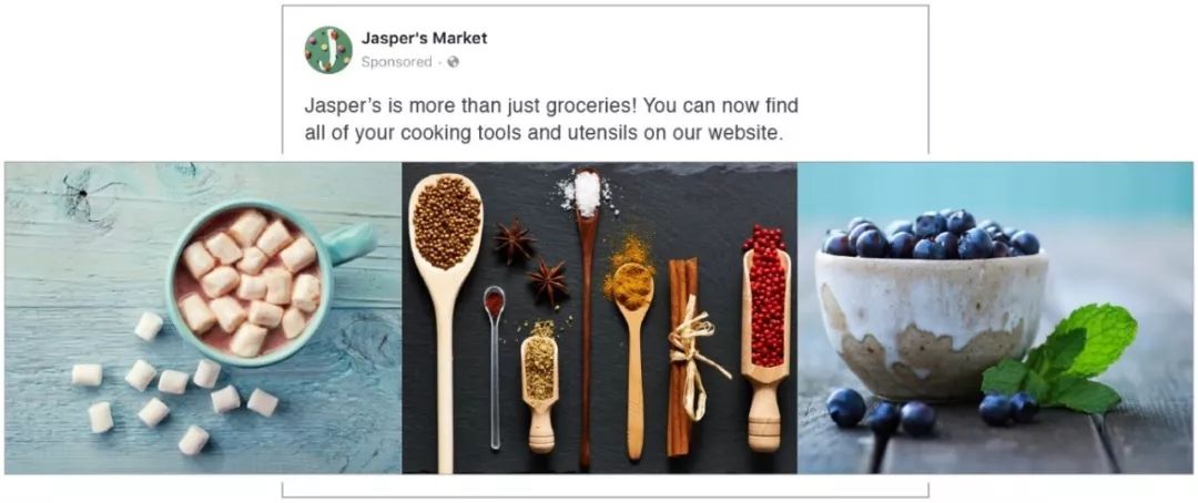 对我们跨境广告主而言,精品栏广告是一个不错的选择,因为这种格式让他们可以结合主打创意展示多项内容。精品栏广告可与访问量、转化量、店铺访问量或目录促销目标结合使用。