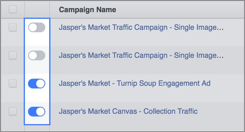 如需控制广告系列、广告组或广告的投放,可以随时开启或关闭广告。可以查看广告系列、广告组或广告旁的开关,了解其投放状态:
