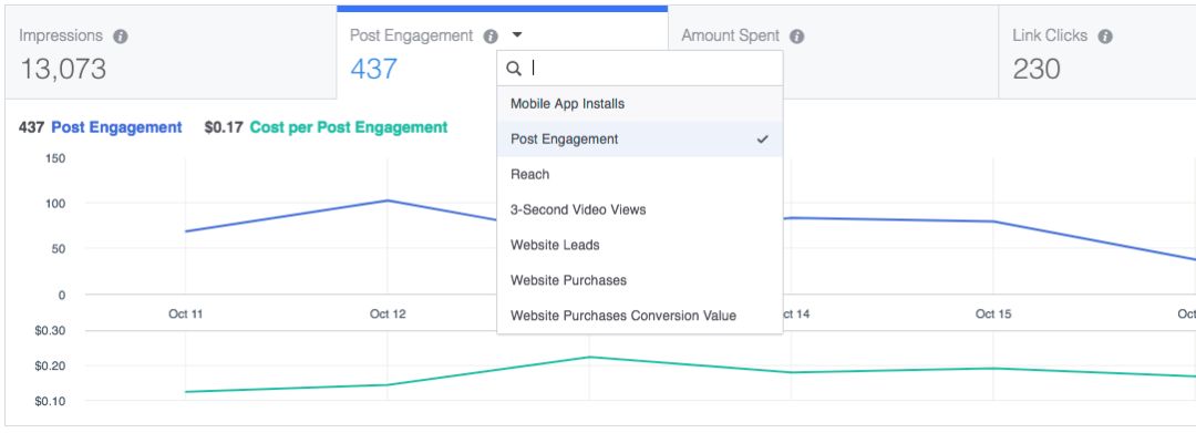 2.自定义想要查看的指标。可以调整四个版块的指标(如:覆盖人数、展示次数、总费用和链接点击量)。要更改在某版块中看见的指标,请点击指标名称旁边的下拉图标,并从列表中选择新指标。