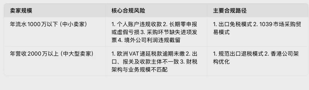 首先,通过以下对照表可快速匹配不同规模卖家的核心风险与合规方向,实现精准自查与定位。