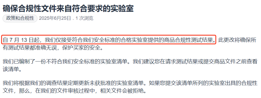 亚马逊新规!7月13日起合规性文件须出自符合要求的实验室!