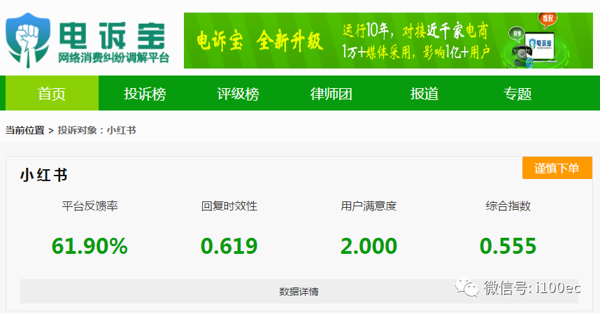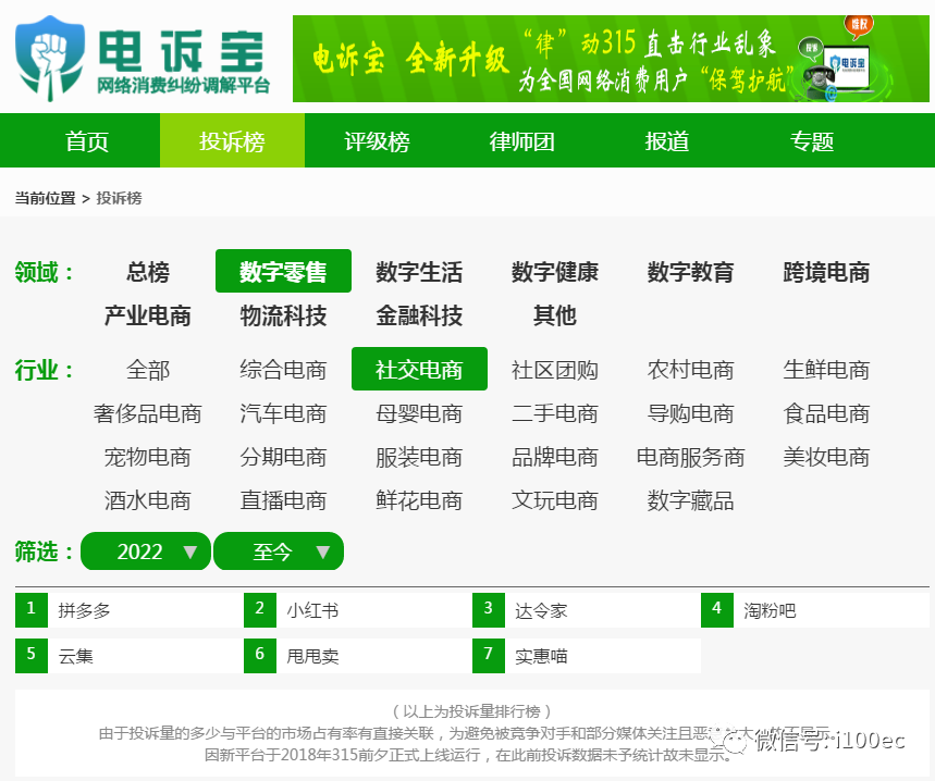 根据“电诉宝”受理的数字零售中社交电商领域用户有效投诉显示(依据投诉量排行),小红书排名第二位,最新评级为“谨慎下单”。2022年至今,同样被投诉的社交电商领域平台还有:达令家、淘粉吧、云集、甩甩卖、实惠喵。