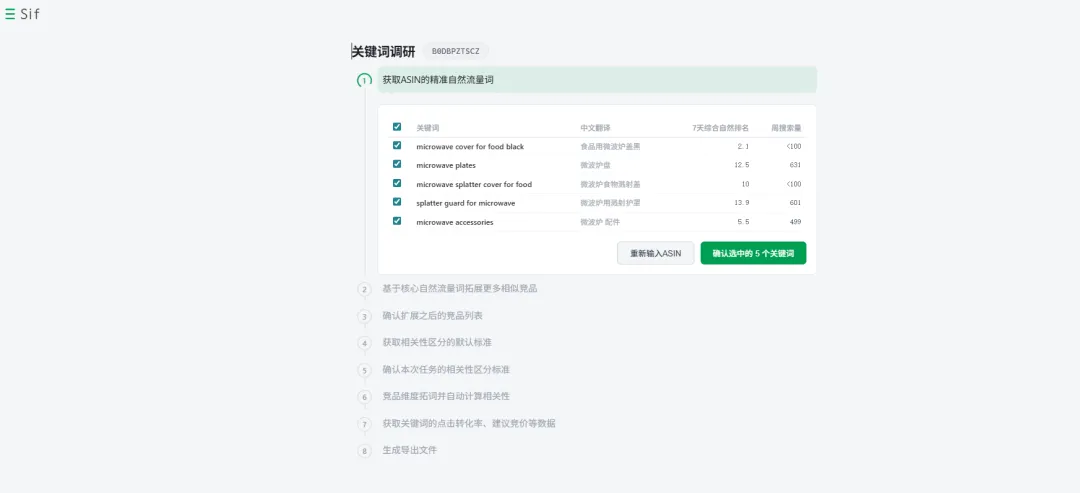操作路径:进Sif的"关键词调研",输入指定的ASIN,按照要求一步步操作,三十秒导出AI词库表。