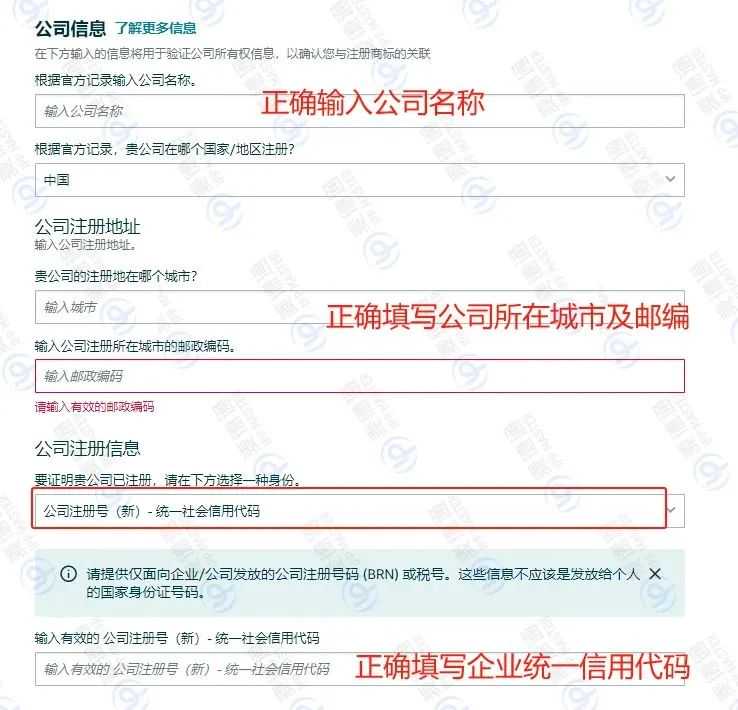 注意:商标申请的公司信息建议与商标局显示的商标申请人信息保持一致,为成功备案,必须正确提供公司名称及企业同统一信用代码,同时正确填写公司所属国籍和所在城市,以便于亚马逊验证公司所有权信息。