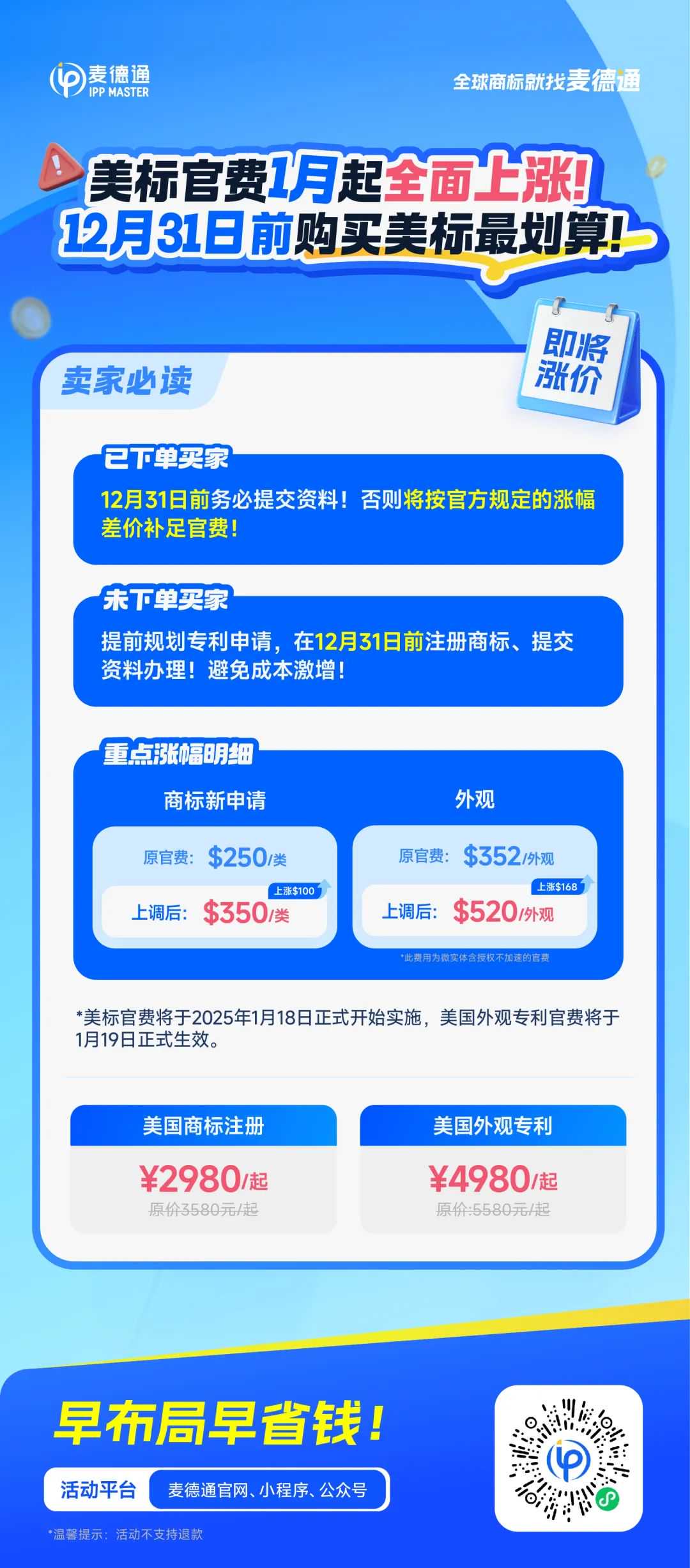 麦德通拥有14年+国际知识产权律师团队为商标服务保驾护航。经验丰富、资质过硬!在商标申请过程中,我们坚持以严谨合规的态度,坚决不采用非专业的法律服务团队,竭力为您提供全面、高效的解决方案。美标价格2025年即将全面上调!务必在12月31日前提交资料!最划算!有需要的朋友可以放心联系麦麦咨询办理↓↓